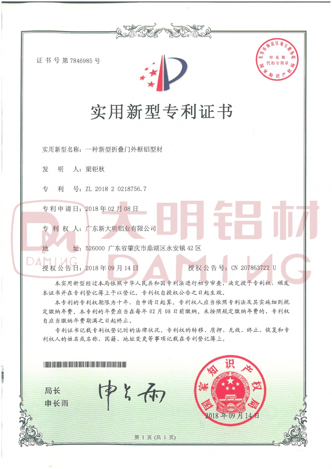 实用新型专利证书